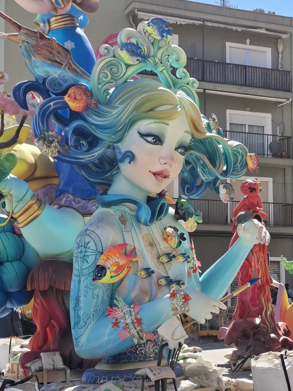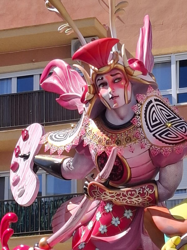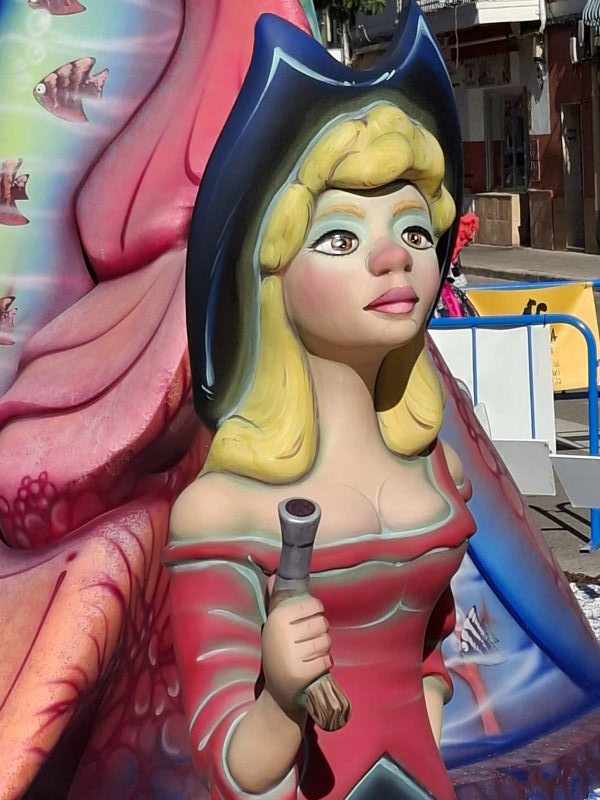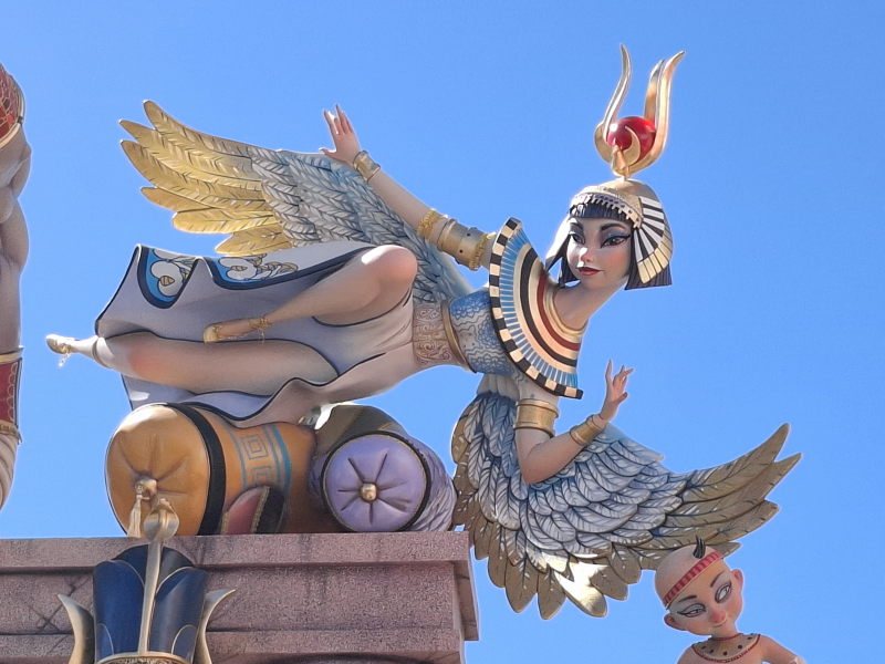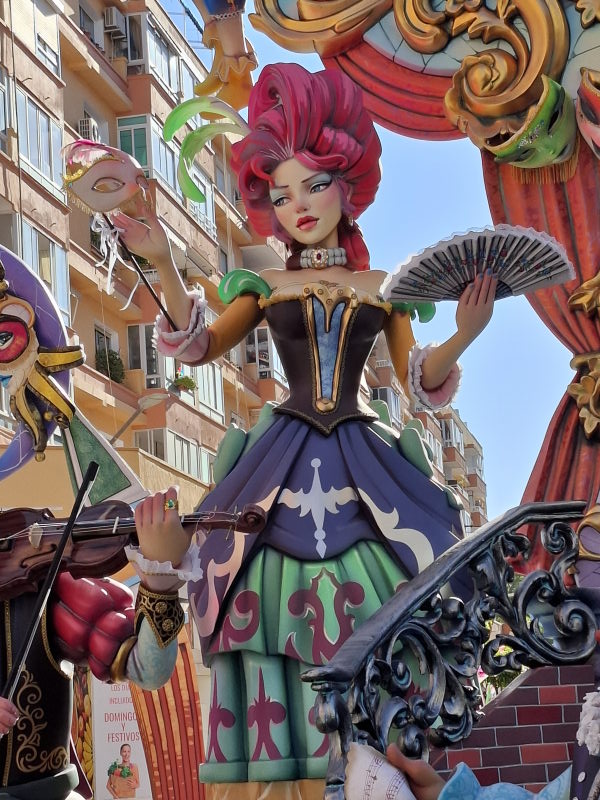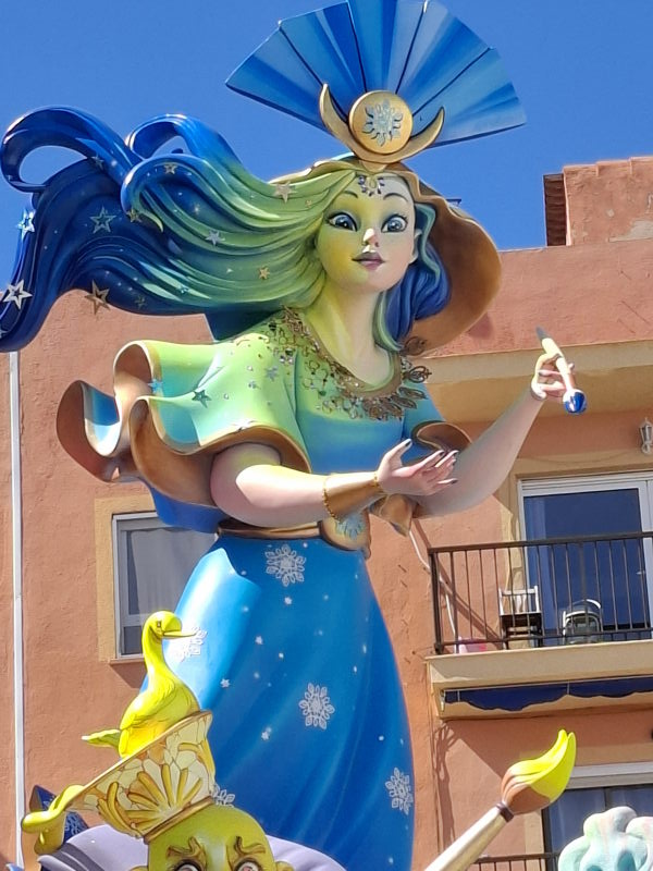 Und dann gibt es da noch die Fallera, die Festkönigin. Jeder Stadtteil hat seine Fallera (und eine Fallera Infantil, die Kinder-Fallera), und es gibt eine zentrale „Fallera Mayor“, die Repräsentantin der Fallas. Sie treten alle in alter Tracht auf: „Das traditionelle Festkleid ist von der valencianischen Mode des 18. und 19. Jahrhunderts inspiriert und besteht aus mehreren Teilen: einem eng anliegenden Mieder, einem weiten Rock aus besticktem Brokatstoff sowie einer Schürze und einem Schultertuch. Viele Stoffe sind aus Seide gefertigt und mit Gold- oder Silberfäden durchzogen. Besonders auffällig ist die Frisur: Neben einem großen Dutt am Hinterkopf gehören zwei seitliche Haarschnecken über den Ohren zur traditionellen Fallas-Frisur. Vergoldete Kämme und Nadeln halten die Konstruktion.“ (aus CostaNachrichten)