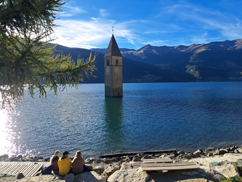 Der Reschenpass (1.507 m Höhe) liegt noch auf österreichischer Seite, die Grenze nach Italien überqueren wir dann kurz dahinter. Wir passieren den Reschensee mit seinem aus dem See ragenden Kirchturm, sichtbarer Rest eines bei der Flutung des Sees untergegangenen Dorfes. Hinter dem Reschensee stellen wir uns auf einen Campingplatz im kleinen Ort St. Valentin auf der Haide (1.470 m Höhe).