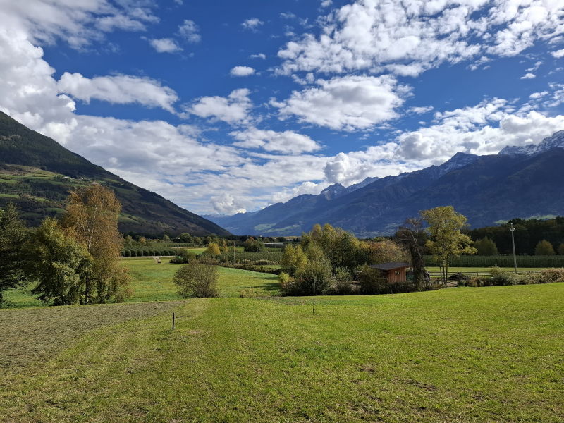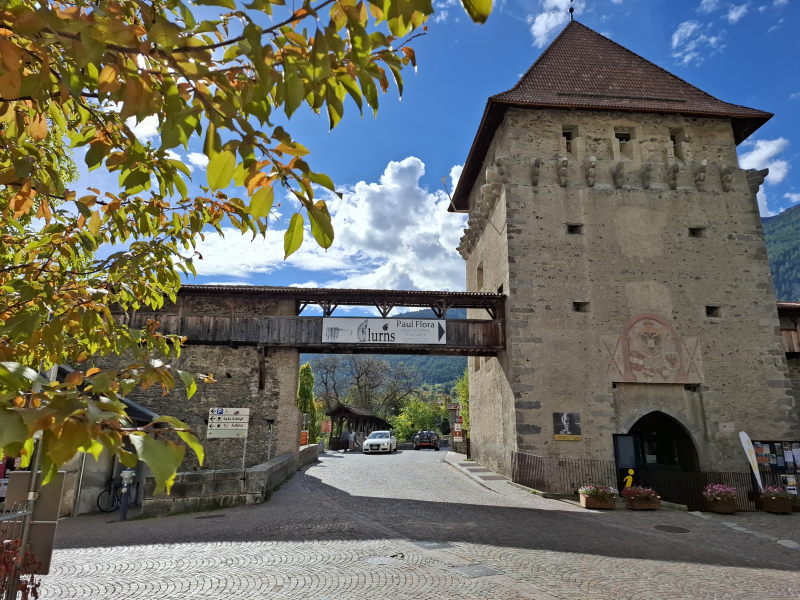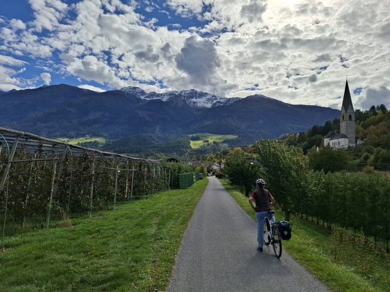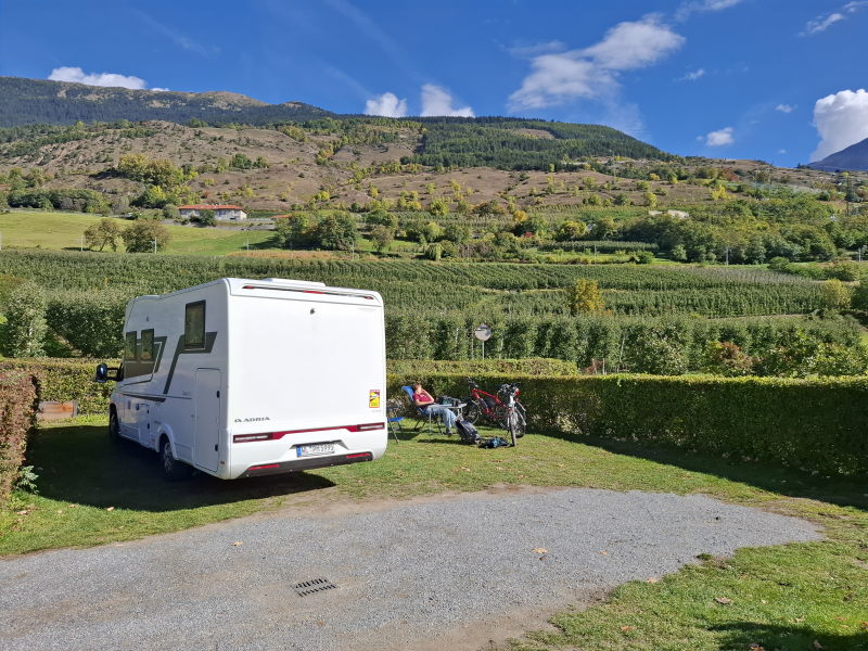 Am nächsten Tag geht es weiter bergab: nur 17 km weiter zwischen Glurns und Schluderns sind wir über 500 m tiefer auf nur noch 910 m Höhe. Vor dem Campingplatz Gloria Vallis gibt es auch 11 einfachere (und günstigere) Stellplätze für Wohnmobile. Die Sonne scheint und es ist warm – wir holen die Räder raus und machen eine knapp 20 km Radrunde durch Glurns, Prads und Schluderns mit fantastischen Ausblicken.