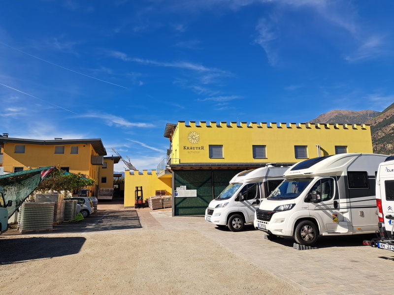 Wir fahren danach nur 25 km weiter zum Kräuterschlössl in Goldrain (auf 650 m Höhe). Toller Hofladen und die Möglichkeit, hier eine Nacht kostenlos zu stehen.