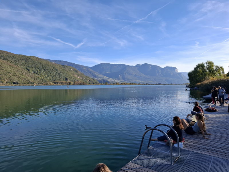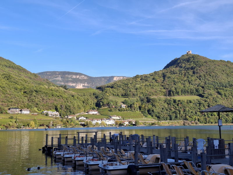 Monika ersteht im Hofladen des Kräuterschlössl noch ein Zirben-Kissen und jetzt duftet es in unserem Schlafbereich wie in einer Alpenhütte! Dann machen wir uns wieder auf den Weg. Bisher war die Strasse in unsere Fahrtrichtung relativ leer, in Gegenrichtung hingegen eine einzige endlose Schlange von Autos, die sich Richtung Reschenpass bewegte. Das wurde jetzt anders: auch Richtung Süden war es bis Meran brechend voll und die Fahrt dadurch auch ziemlich anstrengend. Ab Meran wird es besser, denn wir kommen auf die Autobahn-ähnliche MeBo, die Meran-Bozen-Schnellstrasse, und biegen dann bei Bozen ab zum Kalterer See. Wochenende, gutes Wetter, Herbstferien in Deutschland – es ist sehr voll hier überall und mit Glück bekommen wir noch einen Stellplatz in St. Josef am See (auf 210 m Höhe) – wenige Minuten nach uns ist der letzte Platz auch vergeben.