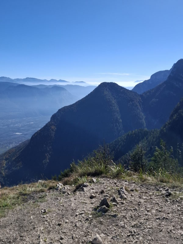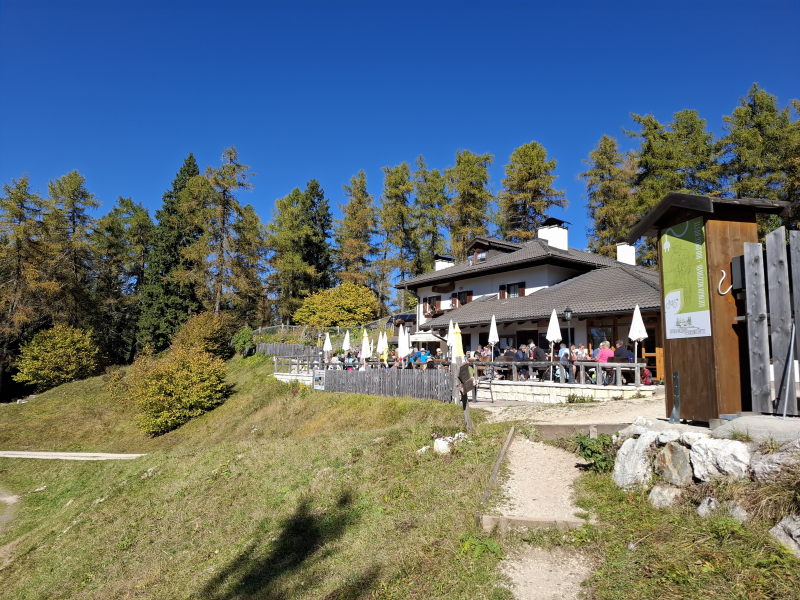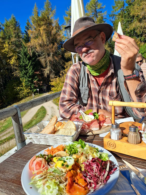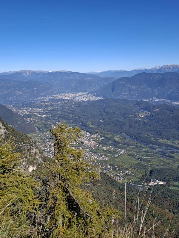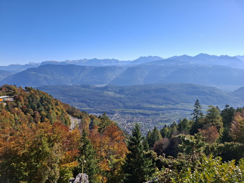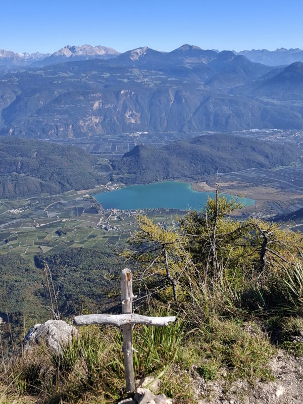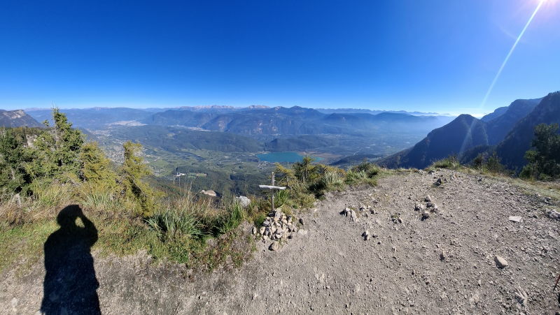 Der Sonntag wird dann ein TOP-Tag! Tolles Wetter mit guter Fernsicht angekündigt – wir müssen rauf! Ein Bus bringt uns hoch nach Kaltern zur Station der Mendelbahn und die bringt uns dann hoch zum Mendelpass auf 1.364 hm. Die Standseilbahn war mit einer maximalen Steigung von 64% lange Zeit die steilste Bahn in Europa. Von der Bergstation wandern wir zur Halbweghütte, stärken uns, und dann geht es noch hoch zum Aussichtspunkt Lavinaspitze auf ca. 1.650 hm. Von dort aus können wir direkt auf unser Womo unten am Kalterer See schauen, ca 1.440 m tiefer. Auch sonst ein ganz fantastischer Ausblick von dort!
